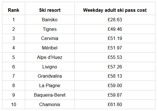 - In Bulgaria’s Bansko, a weekday adult ski pass will cost just £28.63, the cheapest in Europe. Bansko’s ski pass is cheaper than half the price of most ski resorts on our list, and a third of the price of Zermatt in Switzerland, the most expensive ski resort in Europe (£89.42).